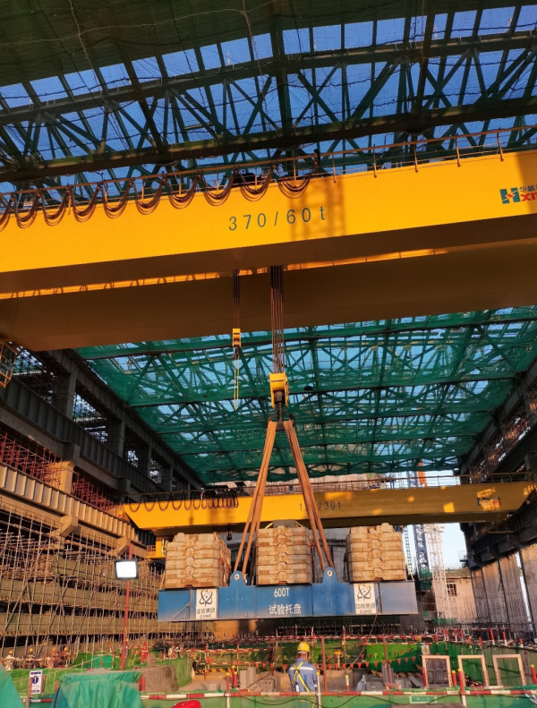 “華龍一號(hào)”漳州核電1號(hào)機(jī)組常規(guī)島兩臺(tái)主行車(chē)上下錯(cuò)層布置,每臺(tái)行車(chē)各配備兩個(gè)吊鉤,每個(gè)吊鉤均需通過(guò)空載、額載、靜載、動(dòng)載等一系列試驗(yàn)驗(yàn)證。