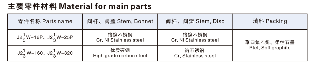 | J21 3W-16P | 鉻鎳不銹鋼 | 鉻鎳不銹鋼 | 聚四氟乙稀,柔性石墨 |