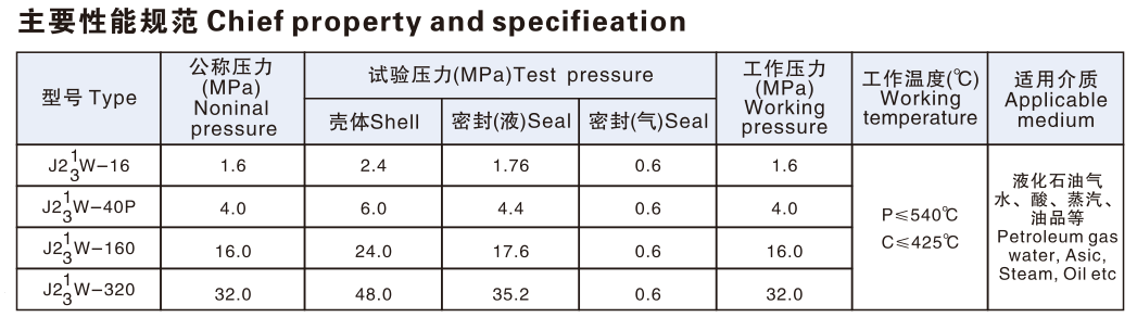 | J13W-16 | 1.6 | 2.4 | 1.76 | 0.6 | 1.6 | P≤540OC | 液化石油氣水,酸,蒸汽,油品等 |