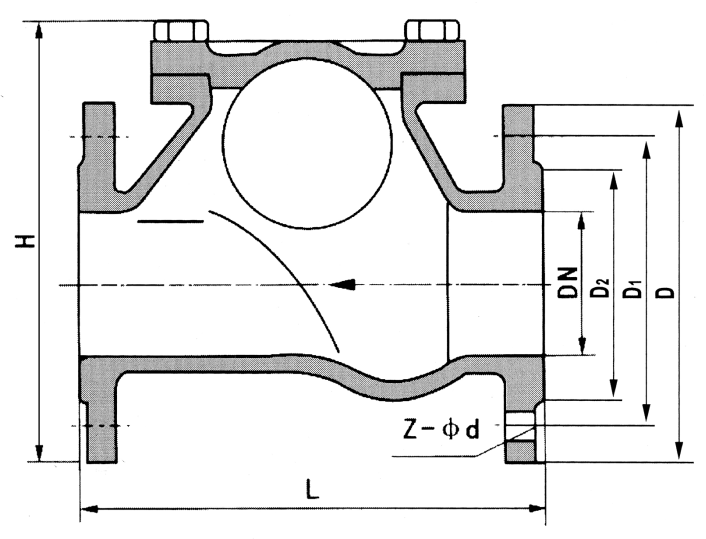 滑道滾球式止回閥,采用橡膠包皮滾球為閥瓣,在介質(zhì)的作用下,可在閥體內(nèi)的整體式滑道上作上下滾動,從而打開或關(guān)閉閥門,密封